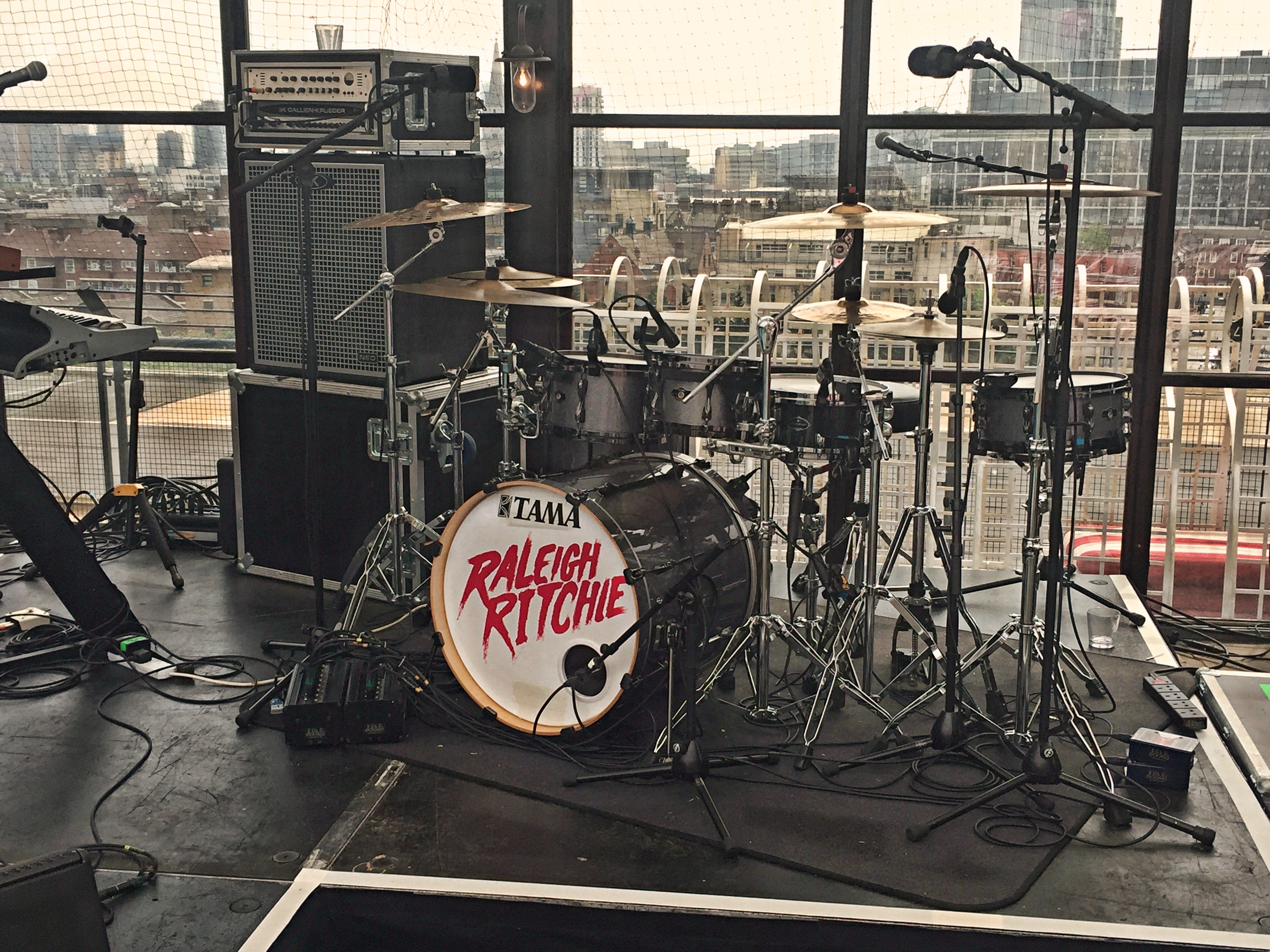 My kit on the roof of Shoreditch House for a secret summer show with Raleigh Ritchie